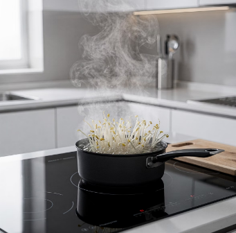 가장 중요한 콩나물 무침 맛있게 만드는법의 기술은 삶기입니다. 물을 자작하게 붓고 소금을 살짝 넣은 뒤, 뚜껑을 닫고 3~4분간 삶으세요. 중간에 절대 뚜껑을 열지 않는 것이 비린내 없는 콩나물 무침 맛있게 만드는법의 철칙입니다.